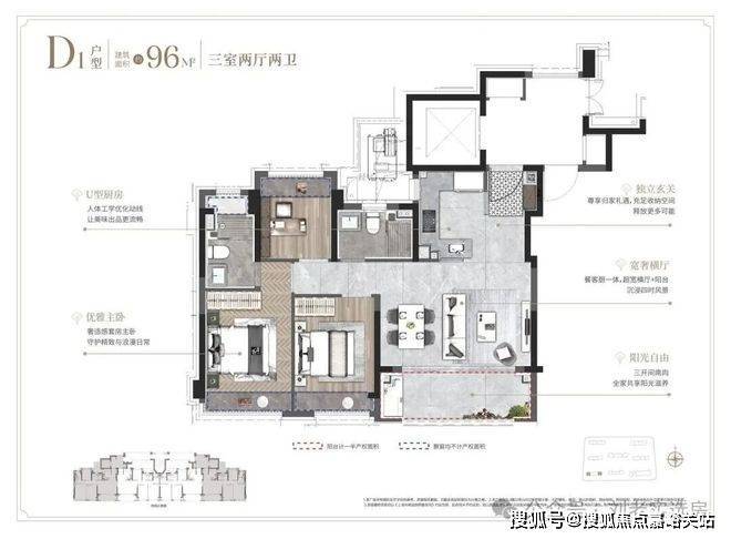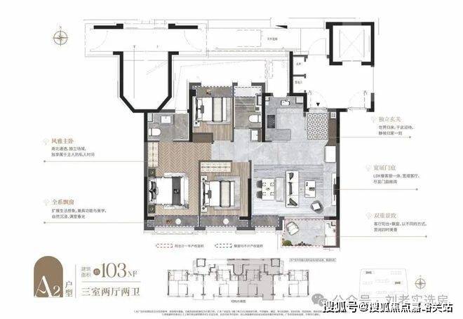项目建面约103㎡3房同样是 三开间+大横厅的布局,但尺度上更进一步。而且灵动空间更多, 全屋飘窗+南向观景阳台,提升性价比的同时也增强户型对外的延展性。