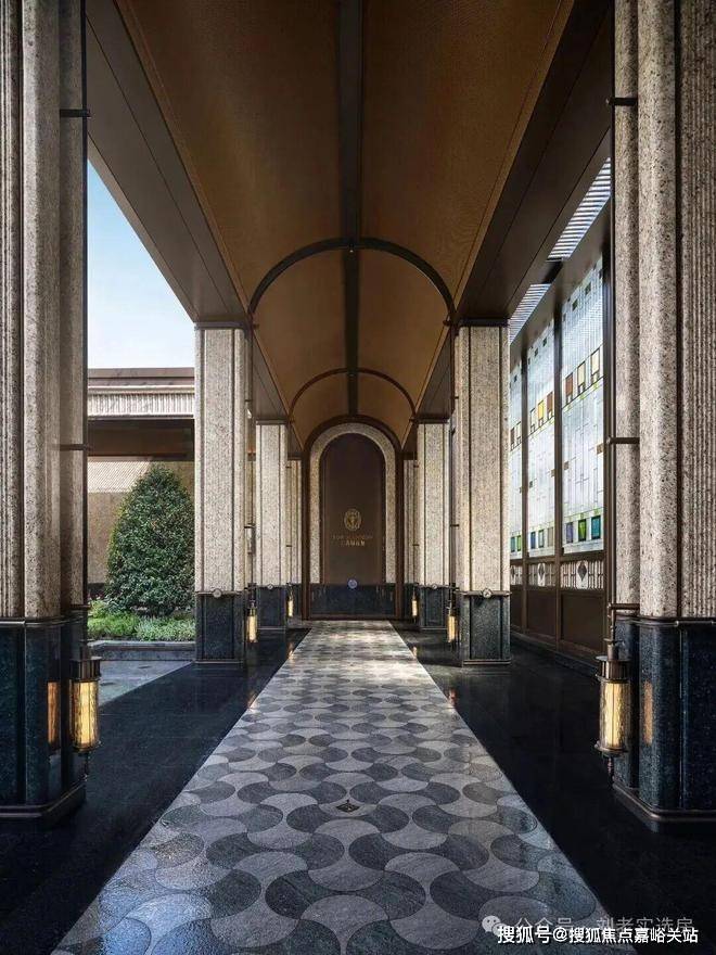 其次,项目的很多细节都融入了海派经典元素,比如落客区美轮美奂的 约300㎡彩色玻璃穹顶,艺术连廊拱形廊道灵感都来自和平饭店。彩绘花窗的拱门造型则取自武康大楼。