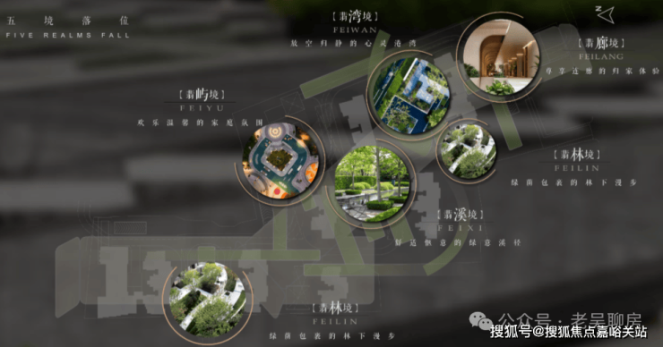 规划了 “翡色五境”五大空间氛围,匠造融入时光、人文海派、自然与艺术、家庭与邻里的 “四轴、三园、五区、一所”四大功能空间。