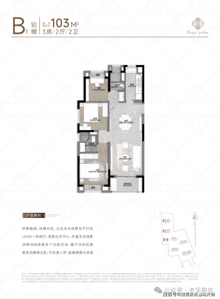 适合三口之家或年轻家庭居住的动静分区户型,厨房、餐厅、客厅及阳台一体化设计,动静完全分区设计,相当人性化!主卧套房设计满满尊崇感;次卫三分离干湿分区设计,考量十分贴心!