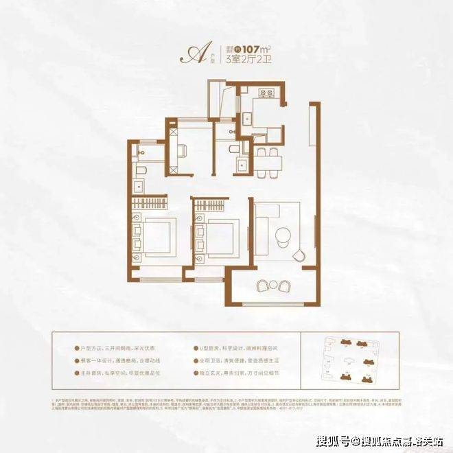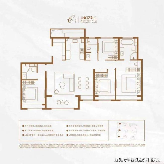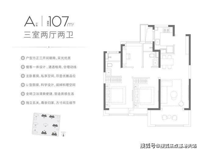 该户型集LDBK一体化、玄关入户、动静分区设计、U型厨房、双卧飘窗、强大收纳等多重优势于一体,在功能性与舒适度上几乎都做到了极致!