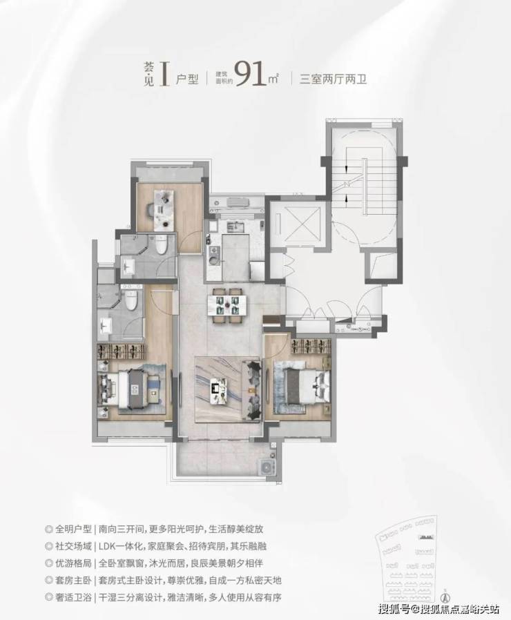 市面上90㎡左右户型两房居多,华发海上都荟建面约91㎡直接 3房一步到位 ,并且有2卫配置, 主卧进阶套房 ,功能性远超同价位竞品!