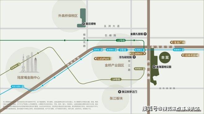 项目位于金桥东,金海湿地公园旁,9/12号双轨交汇,自驾出行的话周边有外环高速、金海高架路、往南还有龙东高架。从通勤角度来看,这是一个去陆家嘴、外高桥、金桥、张江都很方便的地段,可覆盖的人群非常广泛。