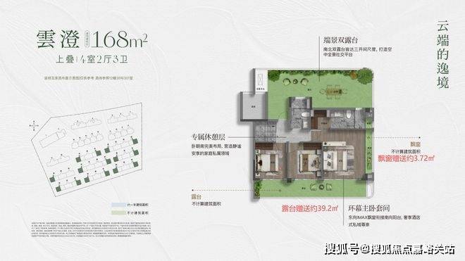 约168㎡上叠;这个户型同样独立电梯厅,但是三面宽设计,南向三阳台空间并列。