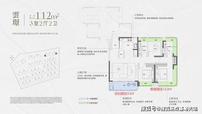 小高层:实得率高达86%,112㎡户型得房面积约96㎡,配备约9.8㎡飘窗和7.2㎡阳台,附赠率超13.4%。南向面宽约11米,层高3.5米,空间通透。