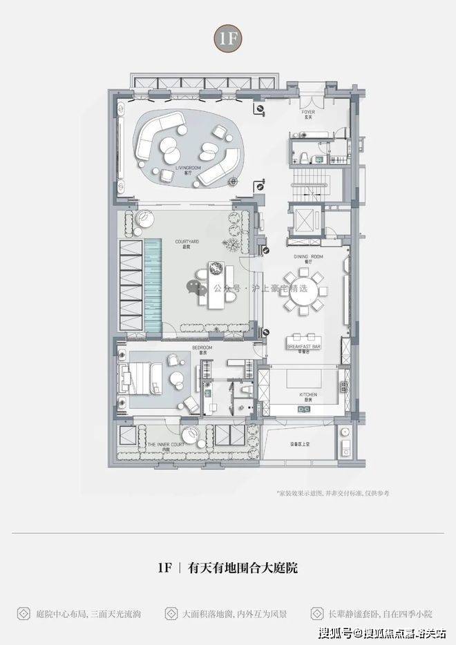 • 庭院中心布局,客厅、餐厅、卧室三面均可采光,内外相映成趣