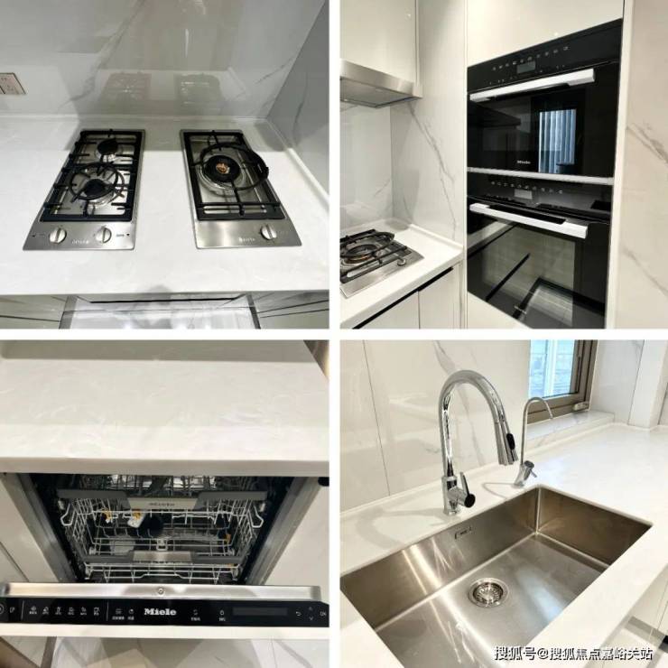 厨房电器采用美诺的5件套(抽油烟机,燃气灶,洗碗机,蒸箱和烤箱),橱柜品牌是博洛尼,弗兰卡水槽搭配抽拉式水龙头相当人性化!