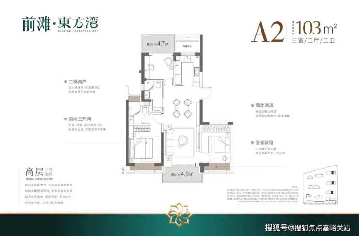 建面103㎡3房2厅2卫, 户型三开间朝南、室内 “5个飘窗+2阳台” ,不管是采光、视野、通风、私密性,还是实用性都十分出色。