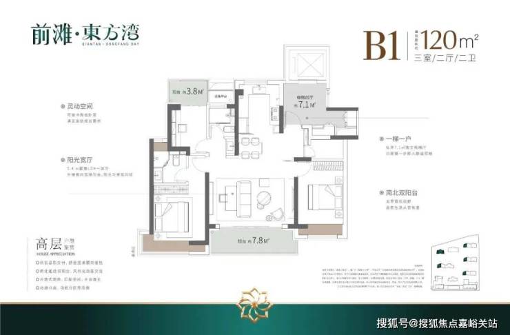 建面约120㎡3房2厅2卫, 做到了3开间朝南+双阳台+主卧套房设计+270°转角飘窗,居住体验、舒适度、尺度感倍增。