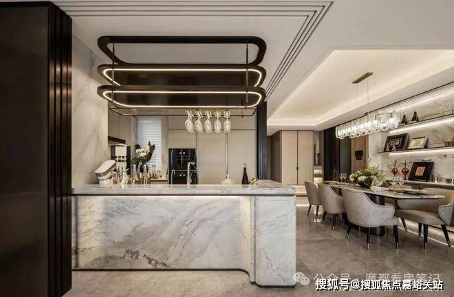 客厅背景墙的“烟雨江南”天然大理石,不同于传统平面背景墙,通过弧度及立体的造型处理,并镶嵌不锈钢材质,对于金茂而言,比奢石昂贵的,是让奢石真正与空间气场融为一体。