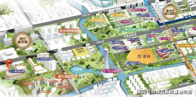 项目占位闵行区浦江滨江板块,地处浦江第一湾三水交汇核心,东侧为市政绿带,与上师大附中(九年一贯制)一路之隔,南侧为公共绿地,西侧为幼儿园,北侧为景观河道,西北侧为现状住宅(大居)。