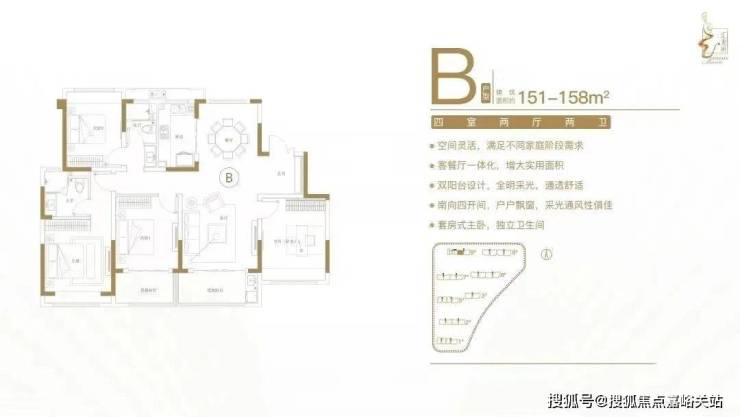 建面约151-158㎡四室两厅两卫户型特点:客餐厅一体化,空间实用,尺度开阔;多功能间设计,满足不同居住需求;全明采光布局,横厅设计,明厨明卫;南向四开间,主生活区域朝南,阳光清风常伴;套房式主卧,主卧带飘窗,独立衣帽卫。