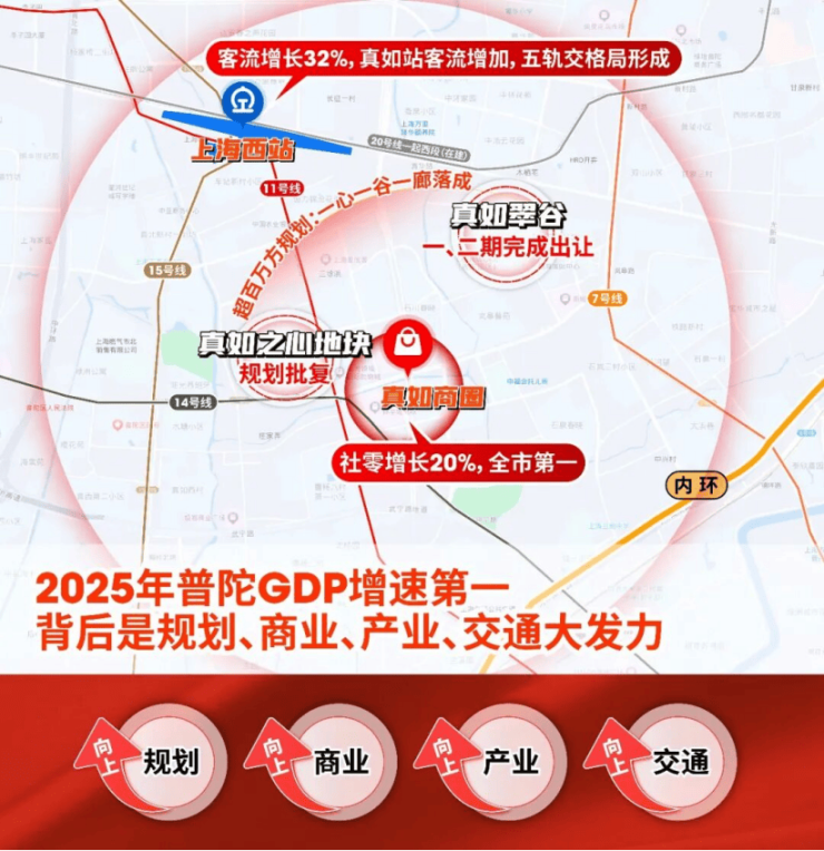 为何环宇玖章能创下现象级热度、让购房者毫不犹豫落位?核心源于市场对真如多年规划全面兑现的高度认可,以及对普陀未来发展的坚定信心。首先,2025年普陀GDP增速领跑市中心、位列全市第一!全市平均增速约5%,普陀以11.83%一骑绝尘,是全市唯一增速破10%的区域。强劲数据印证普陀正进入价值爆发期,早年布局的产业与城建,如今全面进入“收获期”,发展后劲十足。