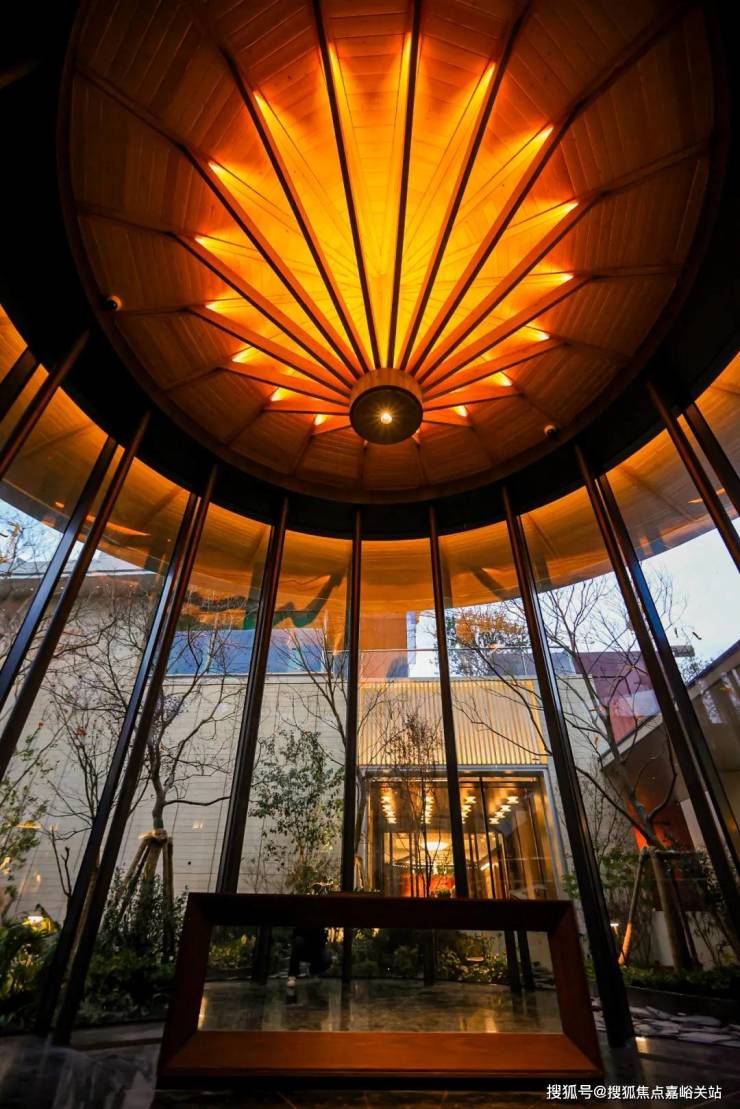 穿过公园进入社区前场,仪式感铺面,类高奢酒店设计,约10米高的「精神之门」矗立。