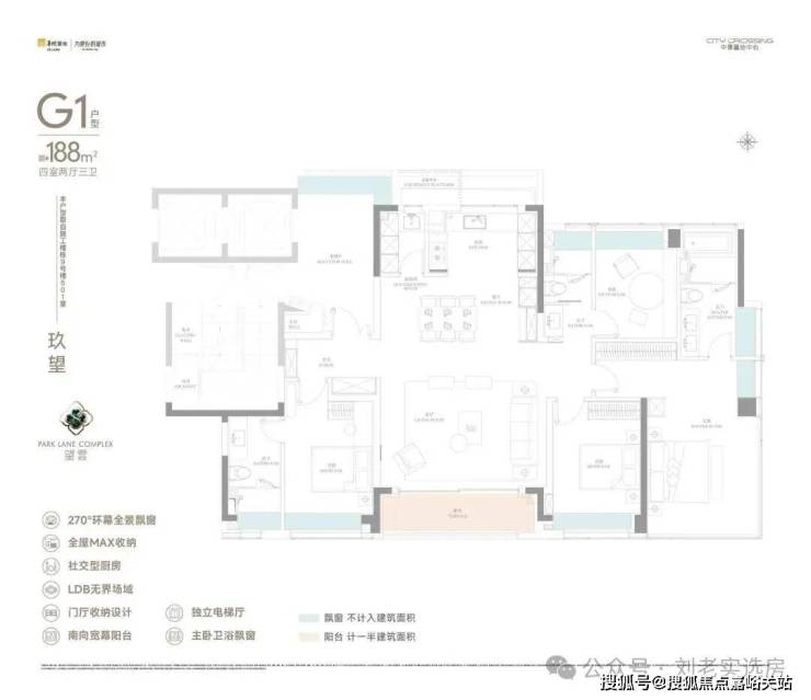 独立电梯厅+四开间朝南+双套房设计+豪华主卧的 约270°无柱转角飘窗,整个户型的尺度感拉满