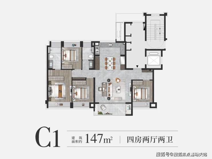 约147㎡4房在户型设计上,不仅做到了四开间朝南,更做到了三房朝南;同时客餐厅+厨房+阳台一线相连,是一个非常标准的南北通透户型,室内的采光以及通风都非常出色,非常适合追求终极改善的购房者。