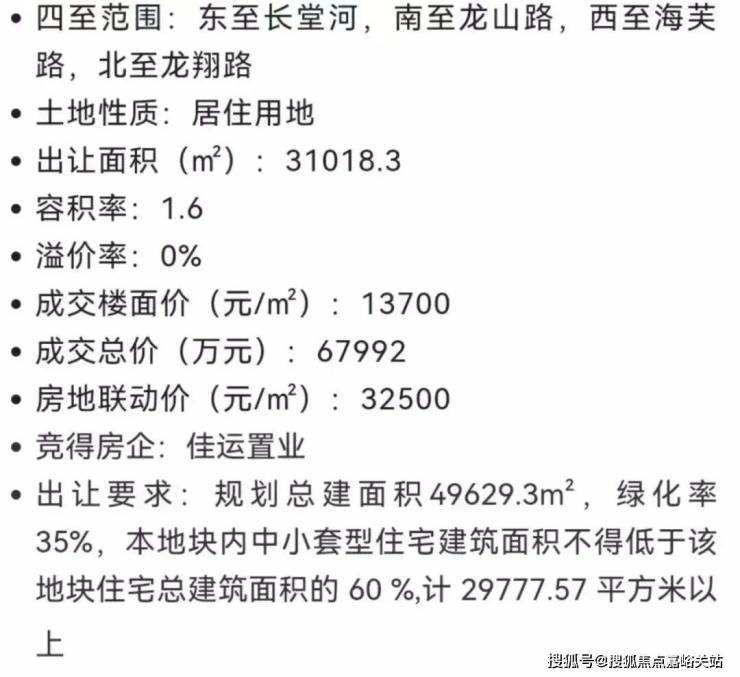 2022年6月7日,上海首批集中供地,佳运置业以总价约6.8亿元竞得金山区金山新城JSC1-0403单元2-20-01地块; 房地联动价32500元/㎡。项目案名为:汇龙府。