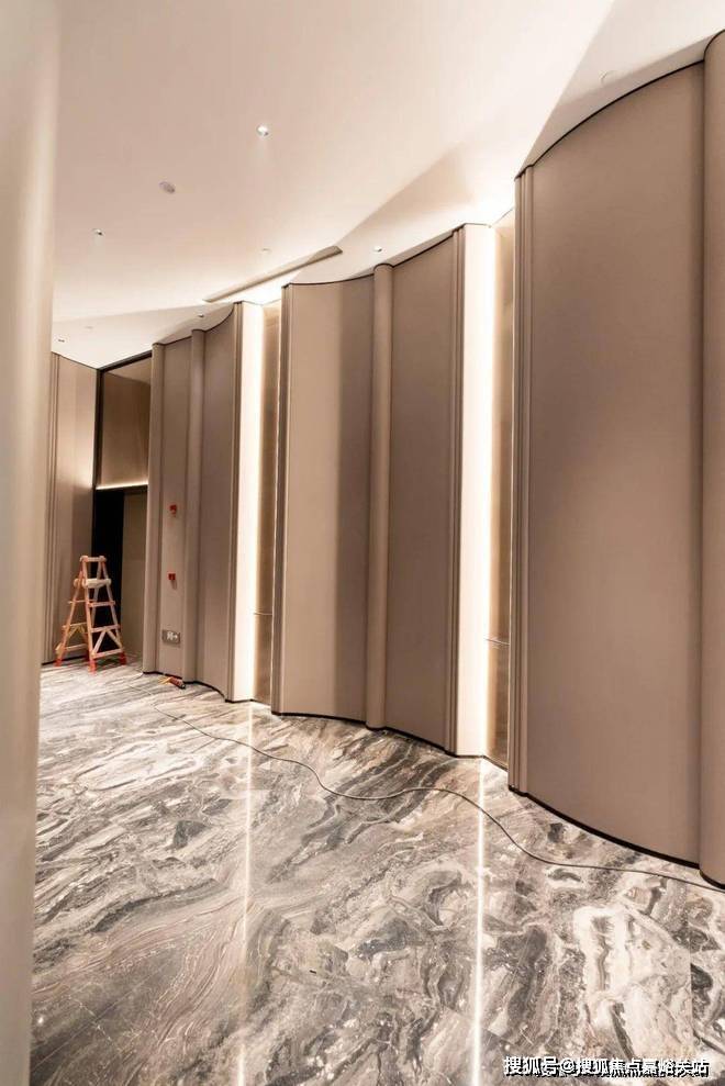 另外,公共区域的圆弧包角采用的是龙骨加铝合金板,全覆盖皮革,细节彰显品质。