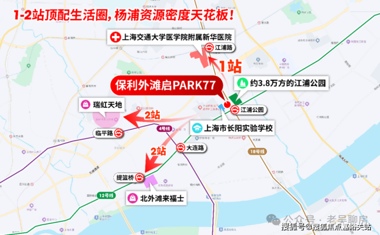 更难得的是,1-2站范围内,三甲新华医院、北外滩来福士、瑞虹商圈、江浦公园、长阳实验学校等顶配资源一应俱全。