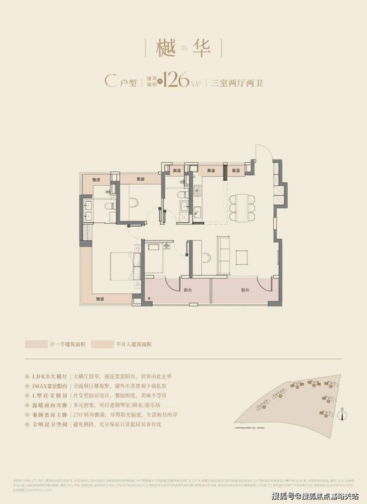 经典动静分离户型,预留分户“S”墙设计,三开间朝南+双阳台,阳台合仅计算一半建筑面积,主卧以及主卫附赠270°转角飘窗;