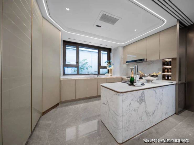 这样的尺度,让多人同时操作毫无拥挤感:半开放式的设计,中餐的煎炒煮炸,西餐的优雅从容,一键切换。家庭成员可围坐岛台煮上一壶咖啡、吃个慵懒的早餐或下午茶也很不错。
