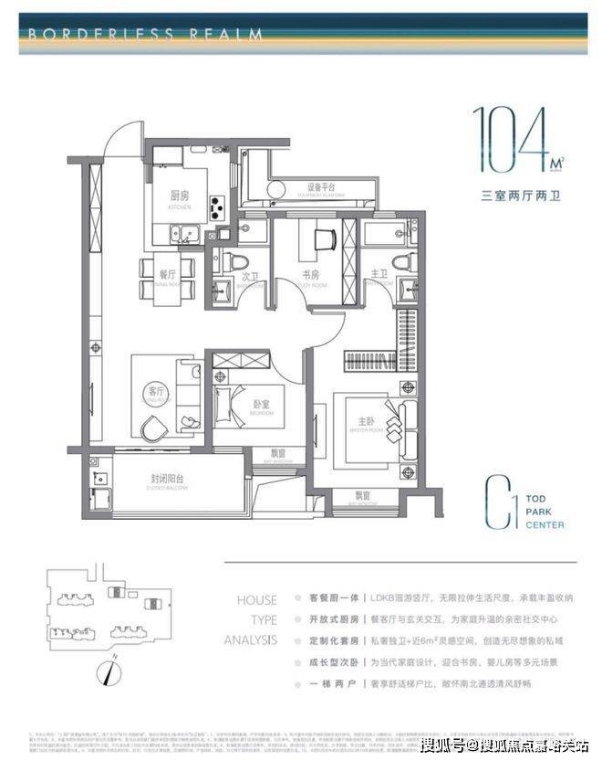 建面约104m²户型特点: LDKB洄游式竖厅+开放式厨房,生活尺度无限拉伸,主卧近6m²灵感空间,承载更多功能可能,成长型的次卧,书房儿童房随心所欲。