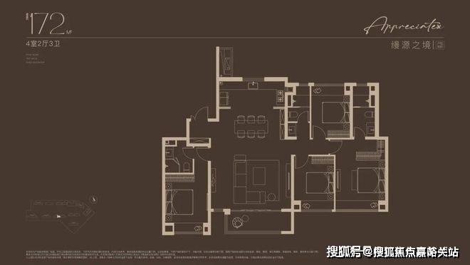 建面约172㎡4房户型,多娃家庭的进阶之选!奢阔尺度尽显家族气度!2梯2户,子母双开门礼序入户,私密尊崇门厅;约16米四开间朝南,搭配约6米尺度横厅,揽四时风景入怀。
