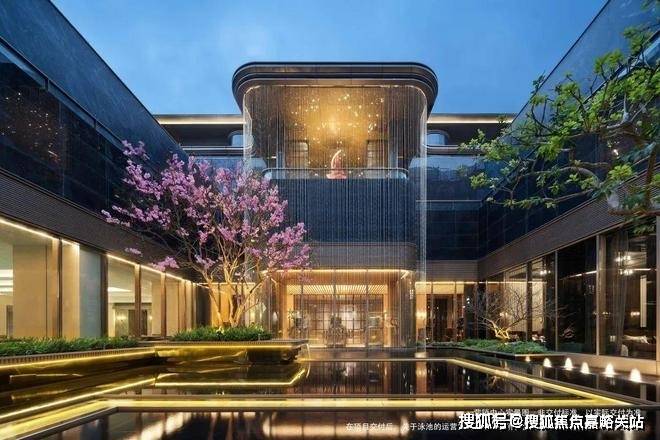 下沉式环幕庭院,跌水景观环绕,池底仿黑金砂与宝石晶片闪烁,点缀百余灯珠,师法“琉璃水光”形意,糅合视听五感,打造全浸式立体园境,天工巧夺,嘉定未见。