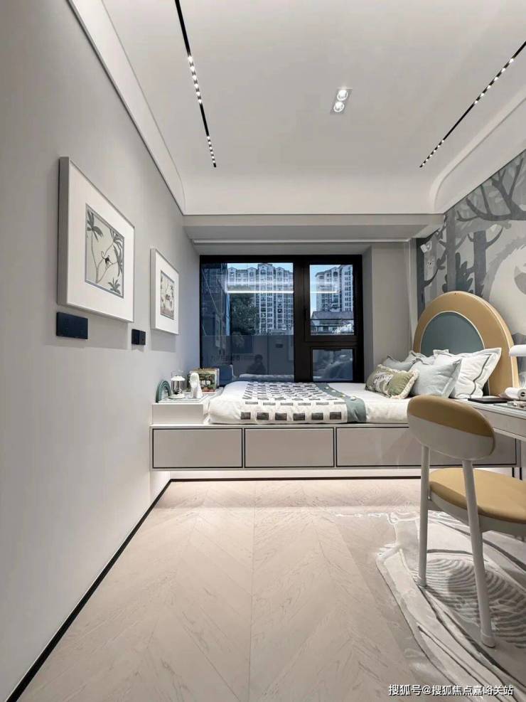 其中主卧的270°转角飘窗就有约5.7m²,通过与外立面的结合,直接做了梳妆台和储物柜,拓展了飘窗的实用性。