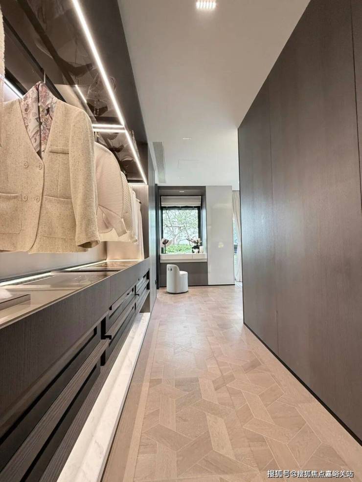 入户门厅也非常讲究,定制级的玄关柜,包括鞋柜+收纳柜+卡座+衣帽区,整齐有序。