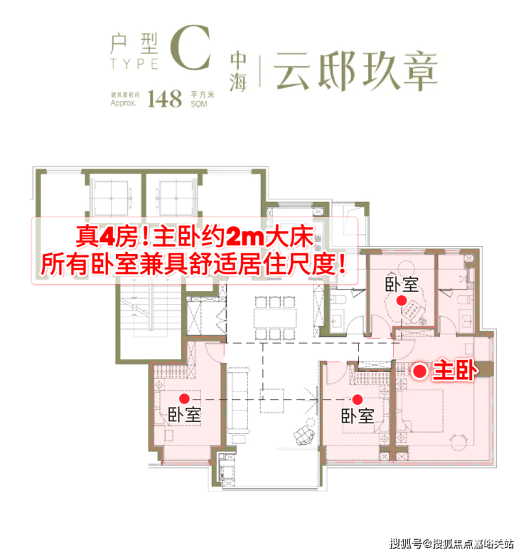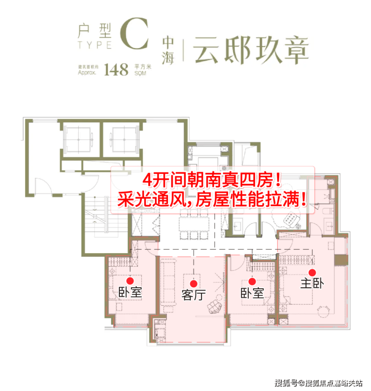 综上所述,中海·云邸玖章的户型在成功前作的基础上又做了大量创新,走在了时代的前列,尤其是建面约148㎡户型在实现真四房的同时,尺度感也能媲美160㎡以上同类竞品,性价比与舒适度兼具,值得关注!