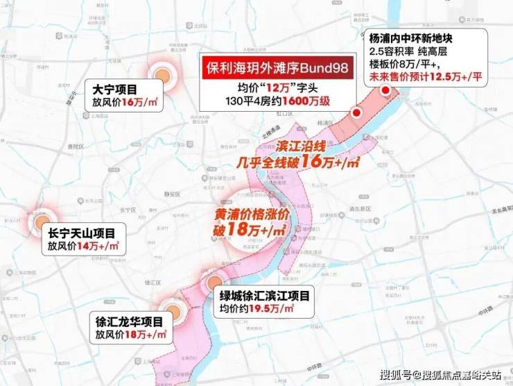 以保利·海玥外滩序BUND98为例,未来售价或突破12.5万+/㎡。乍一听价格不菲,但横向对比同环线项目,堪称 “捡漏价” :大宁项目高层放风价16万/㎡,长宁天山预计14万/㎡,徐汇龙华地块更是直奔18万+/㎡!