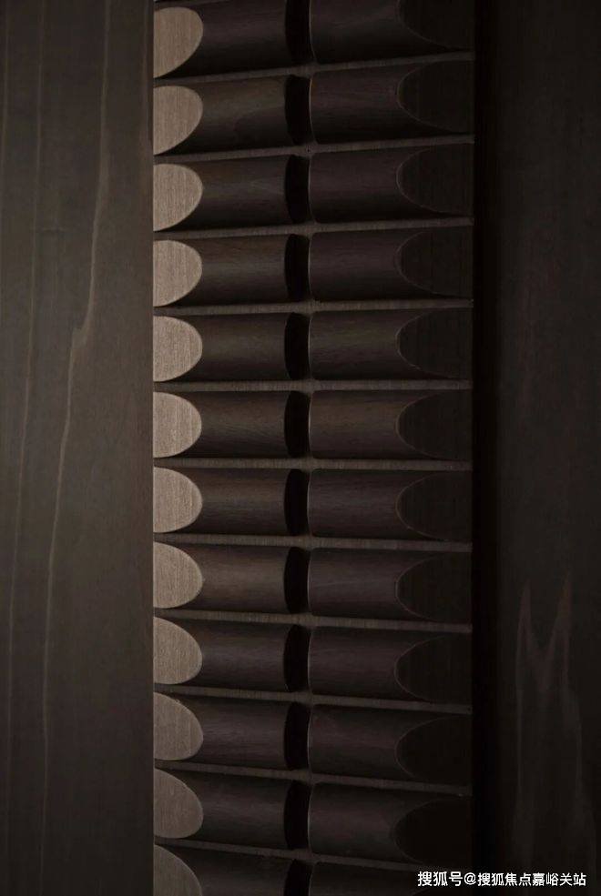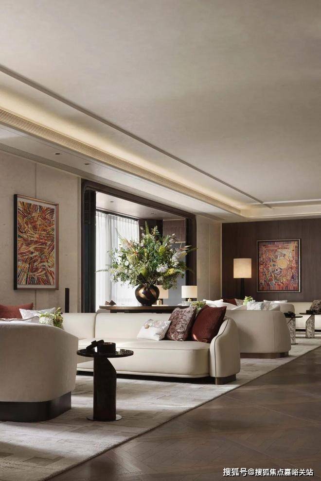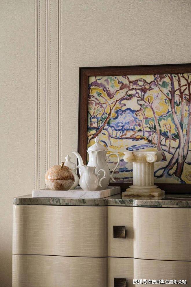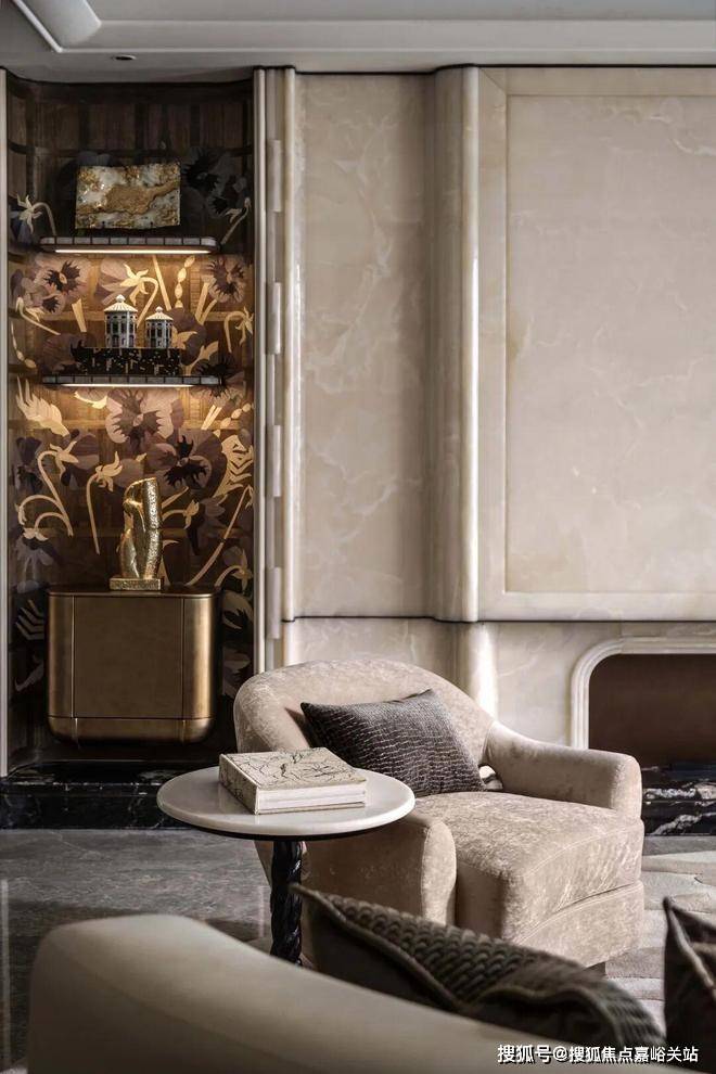 The jade and marble wall, which is as warm as condensed grease, stands still in the center of the living room, like a piece of jade that has accumulated time, becoming the quiet core of the spatial charm. The two sides of the curved carved art wall are symmetrically stretched, with soft and powerful lines, creating a grand and harmonious picture.