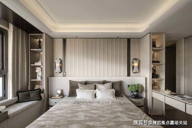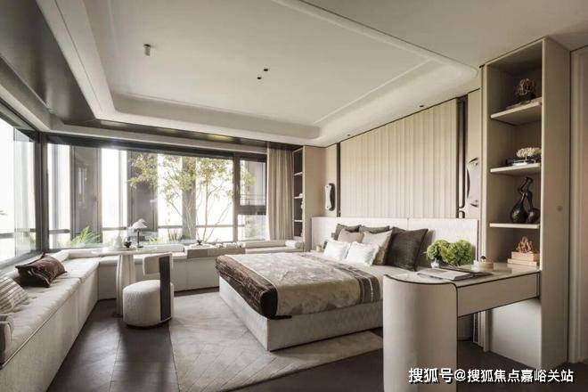 The master bedroom spreads a peaceful poetic atmosphere in symmetry, with warm white leather covering the walls layer by layer with delicate geometric texture, as if the gentle time is layered into the breath of space. By the window, a suspended reading couch is set up by the river - when sitting or lying down, the four seasons flow in all directions.
