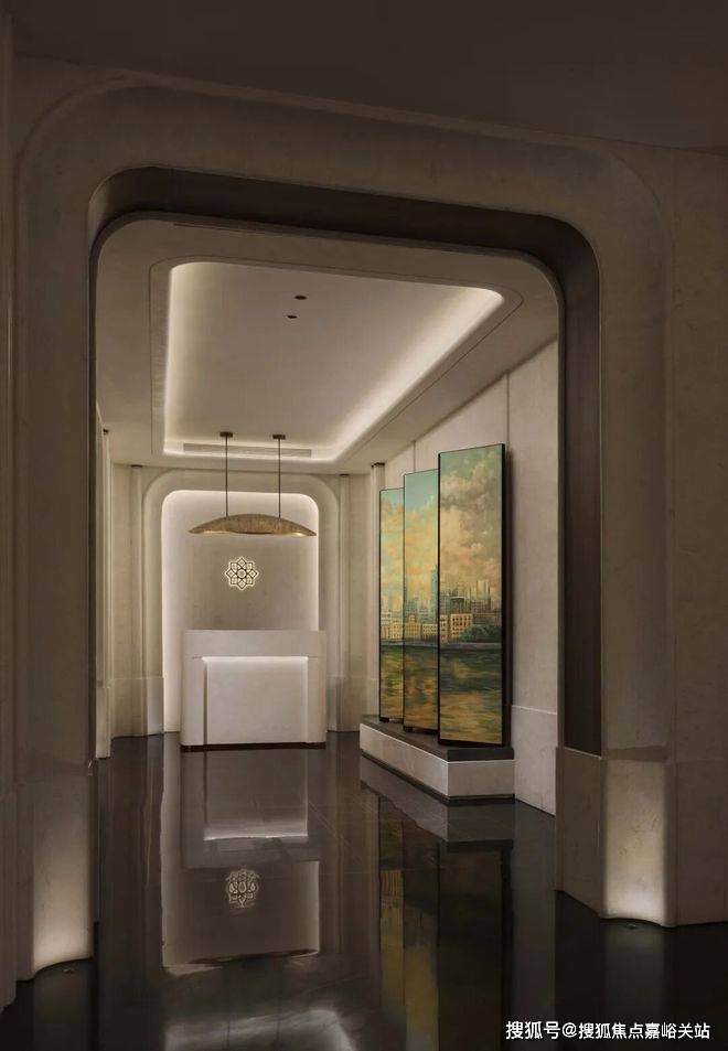 “十里洋场烟花地,风云际会上海滩。”杨浦的百年建筑元素被巧妙转译——圆角门框自大理石中生长,对称的框景细腻勾勒,岩纹斑驳如岁月笺章。这一刻,时空仿若凝固,宛如步入一座光影交织的现代礼堂。