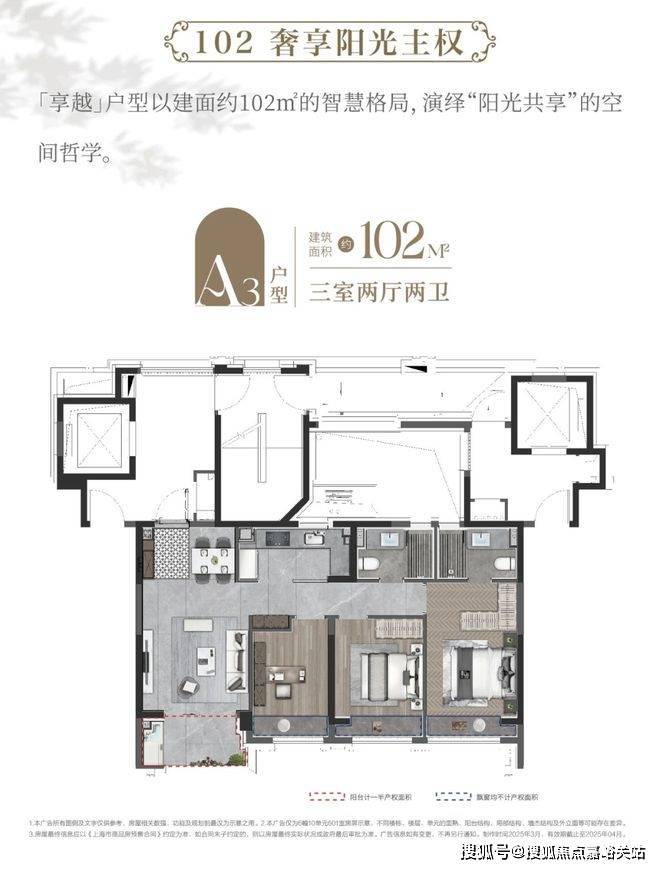 这套建面约103㎡动静分离户型打破常规,兼具三个房间和南向超阔面宽的横厅,以此承载从二人世界到三代同堂的全生命周期需求。