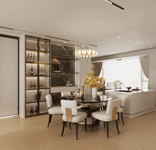 搭配餐厅方正的岛台,设计师尝试了两款餐桌椅+沙发组合,都在空间中创造出具有松弛感的轻奢氛围,#CaracoleSignature 俯瞰圆餐桌,经典黑白金三色配色,与明星款#Caracole 平衡之美餐椅,两者在空间氛围互动,展现流动随意、挺括优雅的质感。