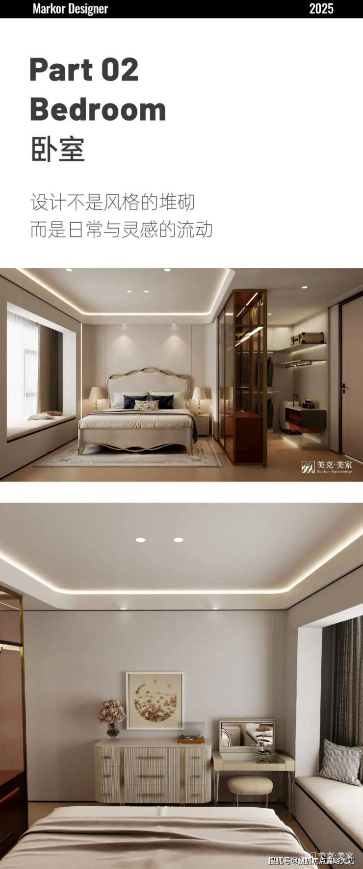 卧室装饰以更细腻的笔触勾勒法式风格的优雅与从容,主卧#CaracoleSignature 臻萃软包床金属色涂装飘逸的线条,与现代感的茶色全玻璃衣帽间,这种差异与对比正是设计的有意为之,不带偏见地融合古典与现代。