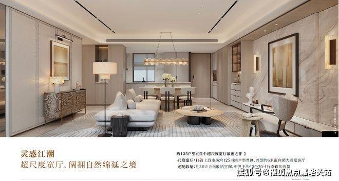 「灵感江潮」:约125㎡户型,首创约6米南向超大面宽客厅,边户可拓展至近9米面宽,配独立岛台,超配约20m³收纳系统。