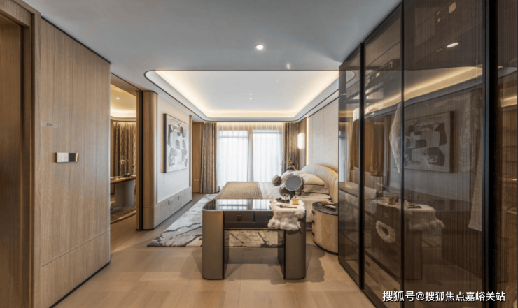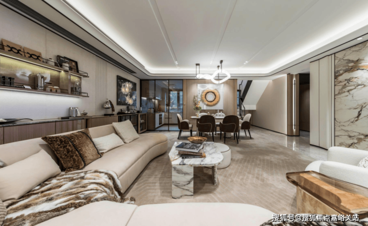 以下叠为例,进入样板间的瞬间,我们就能发现,整个室内空间,几乎看不到一个直角: 圆弧木饰面、圆弧吊顶、圆弧踢脚线,以及大量的皮革编织纹软包,都在诉说着工艺的繁复。
