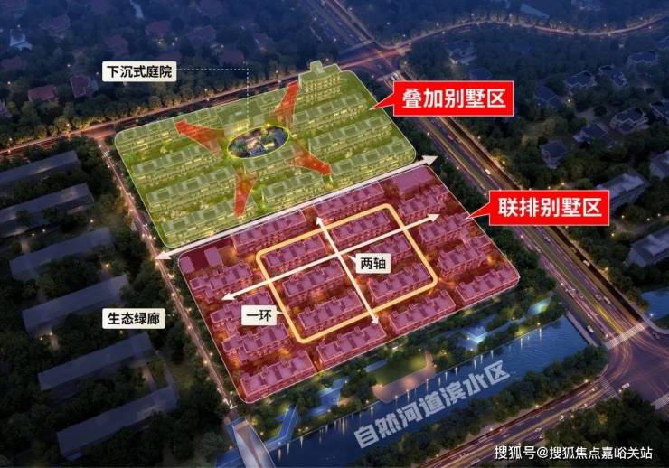 社区内以东西向的生态绿廊为轴,将园区自然分成2个墅区,北侧为4层叠加别墅区,南侧为3层联排别墅区。