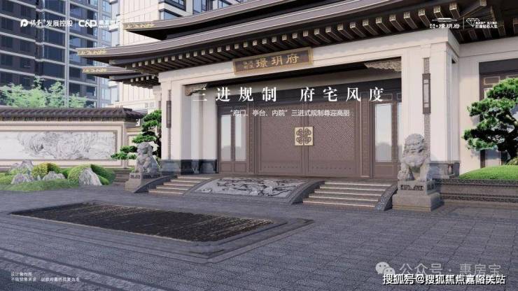 为契合嘉定文化的阔大气象与城市未来的宏观远望,特别以建发房产恢弘见称的「王府中式」产品类型,致敬嘉定的雄浑气魄,[王府中式」产品遵循中式礼序思想,提出“儒门、道园、唐风、华纹”匠造理念。雕琢干道工序,承干年王府规制,呈现“满像繁华”的东方意境。通过当代审美笔触,深入探寻东方构造与意境之美。