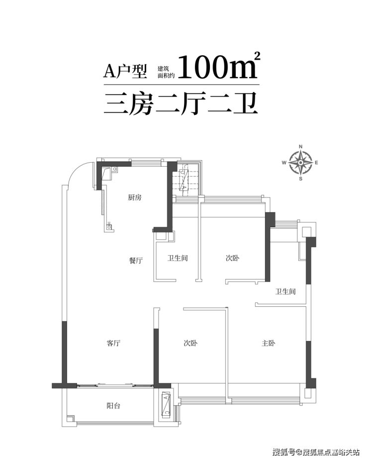 建筑面积约100㎡雅致三房两卫,满足二娃时代