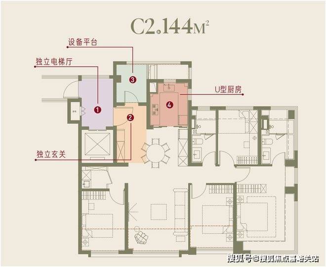 南向面宽达13.4m,四开间朝南,全卧超南。实得率超95%,多了20平空间,三阳台,满飘窗,设备平台,主卧室270°套间设计。层高3.15米。这个户型对比样板房,储藏间更大了,玄关收纳空间更大,收纳空间更多