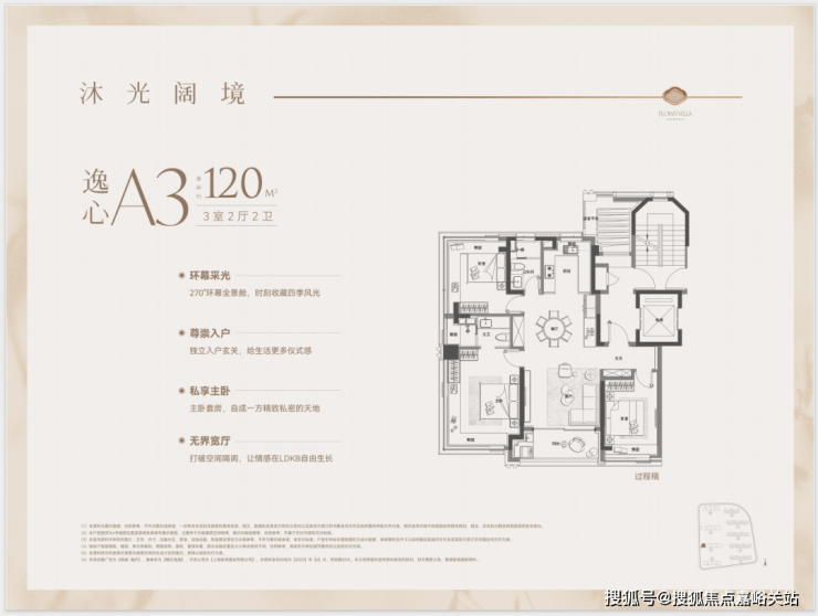 户型特点:边套户型,3开间朝南,方正格局。客餐厅一体化设计,餐厅空间宽敞,客厅进深较短但可通过与阳台连通优化空间感。全屋飘窗设计,边套南北卧室为270°转角飘窗,采光充足。独立电梯厅约7-8㎡,可改造为玄关或收纳空间。