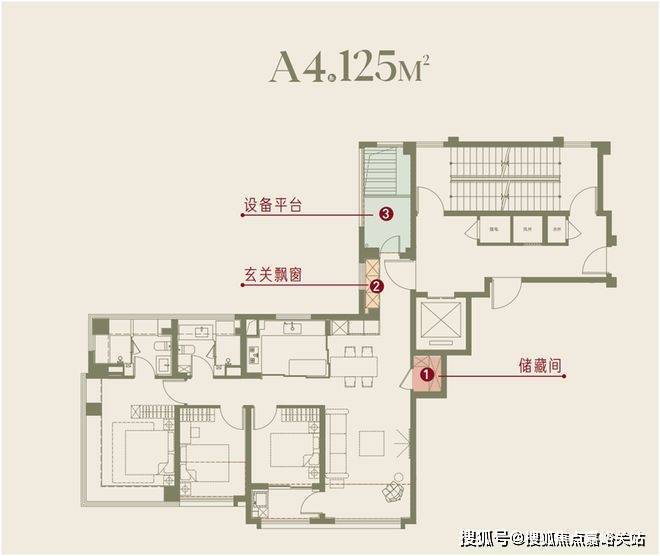 南向面宽达13.4m,四开间朝南,全卧超南。实得率超95%,多了20平空间,三阳台,满飘窗,设备平台,主卧室270°套间设计。层高3.15米。这个户型对比样板房,储藏间更大了,玄关收纳空间更大,收纳空间更多