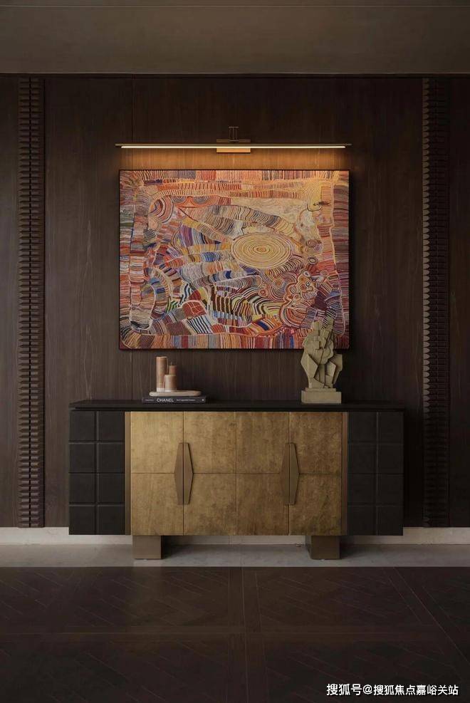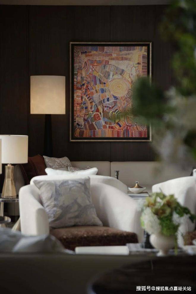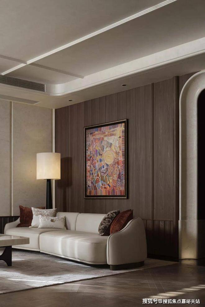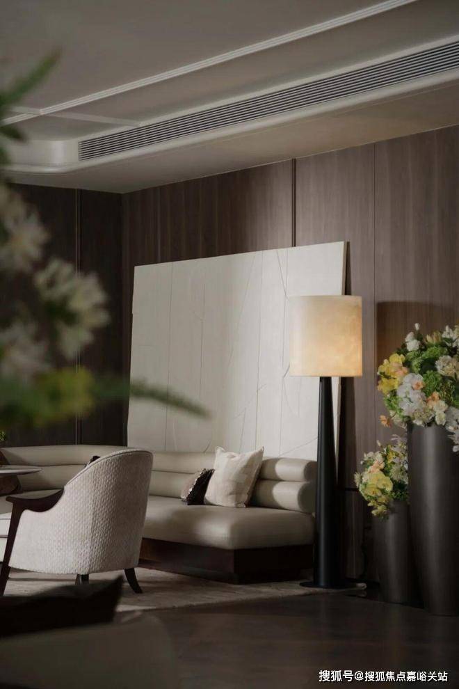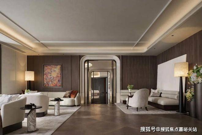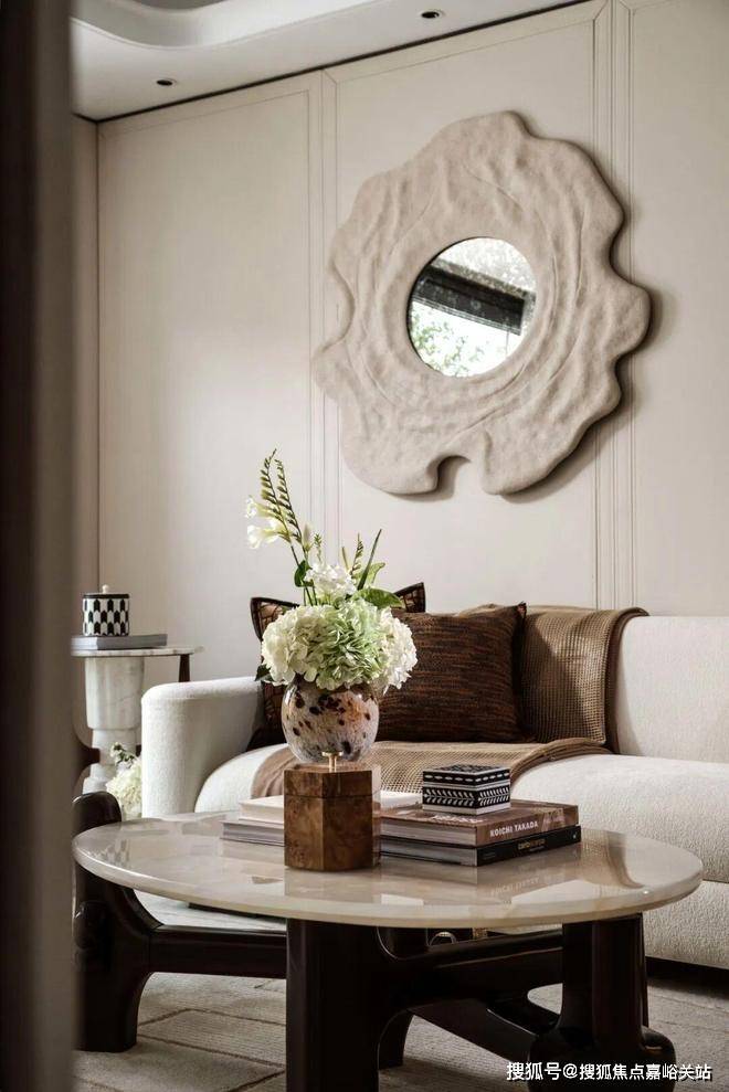 The jade and marble wall, which is as warm as condensed grease, stands still in the center of the living room, like a piece of jade that has accumulated time, becoming the quiet core of the spatial charm. The two sides of the curved carved art wall are symmetrically stretched, with soft and powerful lines, creating a grand and harmonious picture.