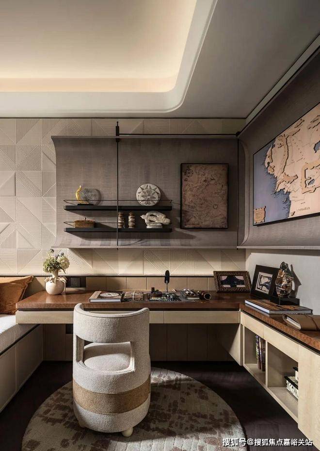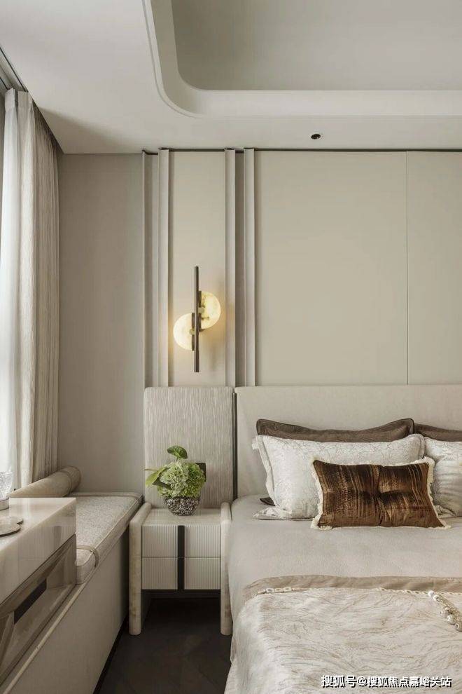 The master bedroom spreads a peaceful poetic atmosphere in symmetry, with warm white leather covering the walls layer by layer with delicate geometric texture, as if the gentle time is layered into the breath of space. By the window, a suspended reading couch is set up by the river - when sitting or lying down, the four seasons flow in all directions.