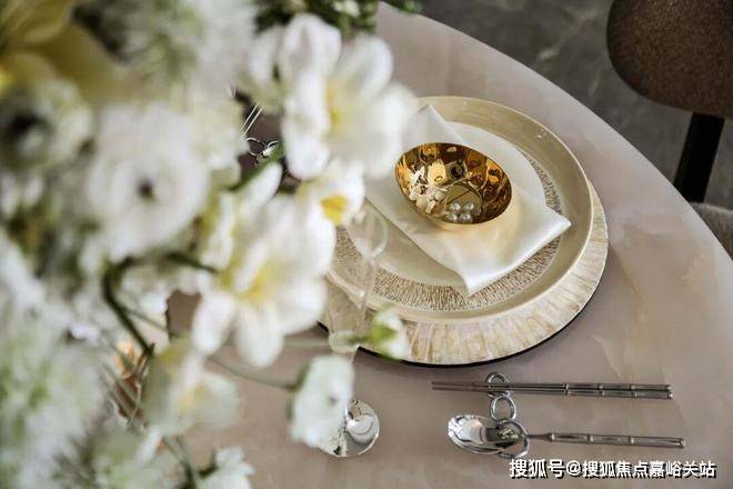 餐厅中,Art Deco风格的餐桌以利落几何线条定调,上方花瓣状吊灯洒下温柔光晕,勾勒出一幅海派法式的浪漫剪影。