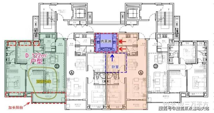 建面约122㎡的D型边户户型(3房2厅2卫),标准南向三开间,加长阳台和数量较多的飘窗配置诚意满满,是楼栋位置、采光、噪音等综合条件最好的户型;后期选房时,如果想购置该房型可能会面临较大的竞争压力。